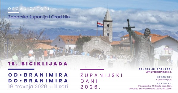 16. biciklijada „Od Branimira do Branimira“ Zadar-Nin, održat će se u nedjelju, 19. travnja 2026. godine u trajanju od 11,00 do 13,00 sati . Biciklijada koja spaja Branimirovu obalu u Zadru s Branimirovom obalom u Ninu okupit će još jednom profesionalce i amatere, ali i turiste koji se u to vrijeme zateknu u Zadru. Organizatori ove manifestacije su Zadarska županija i Grad Nin, a partneri su PU zadarska, Zavod za javno zdravstvo Zadar, Biciklistički klub Zadar, TZ Grada Nina i HAK.